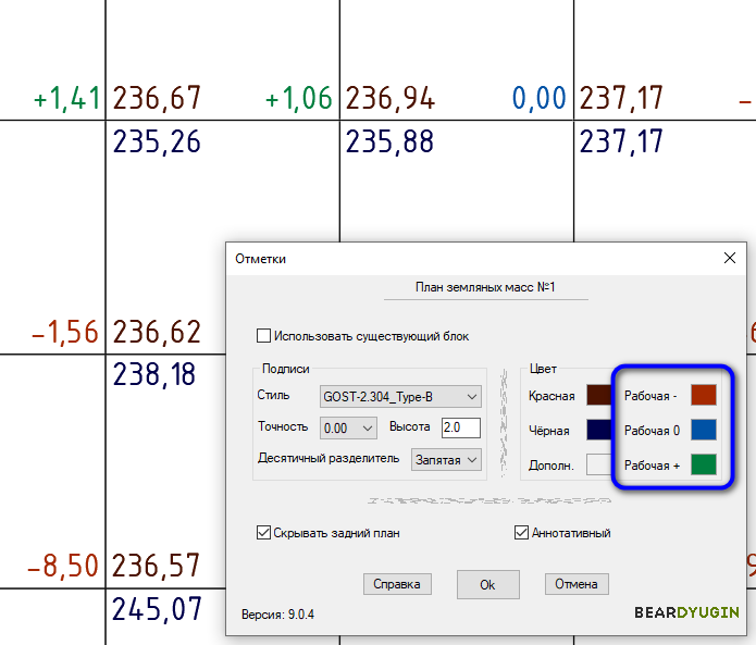 1. При подписи отметок, для рабочей можно задать разный цвет в зависимости от знака.