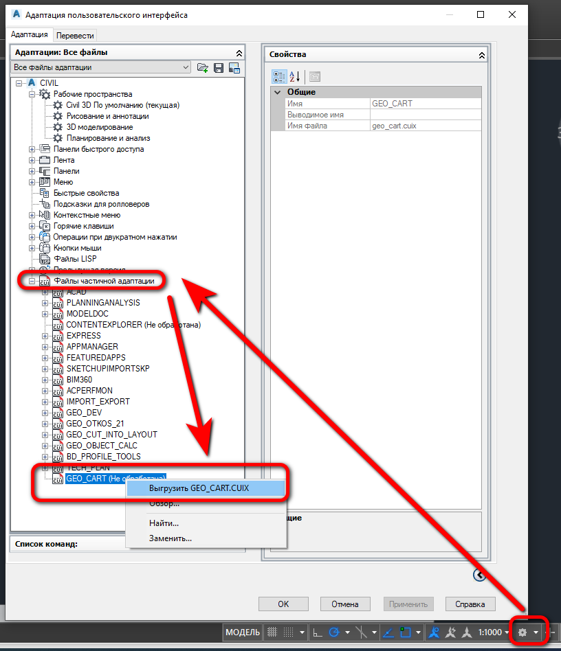 3) Запускаем Civil, выгружаем адаптацию "Geo_Cart"