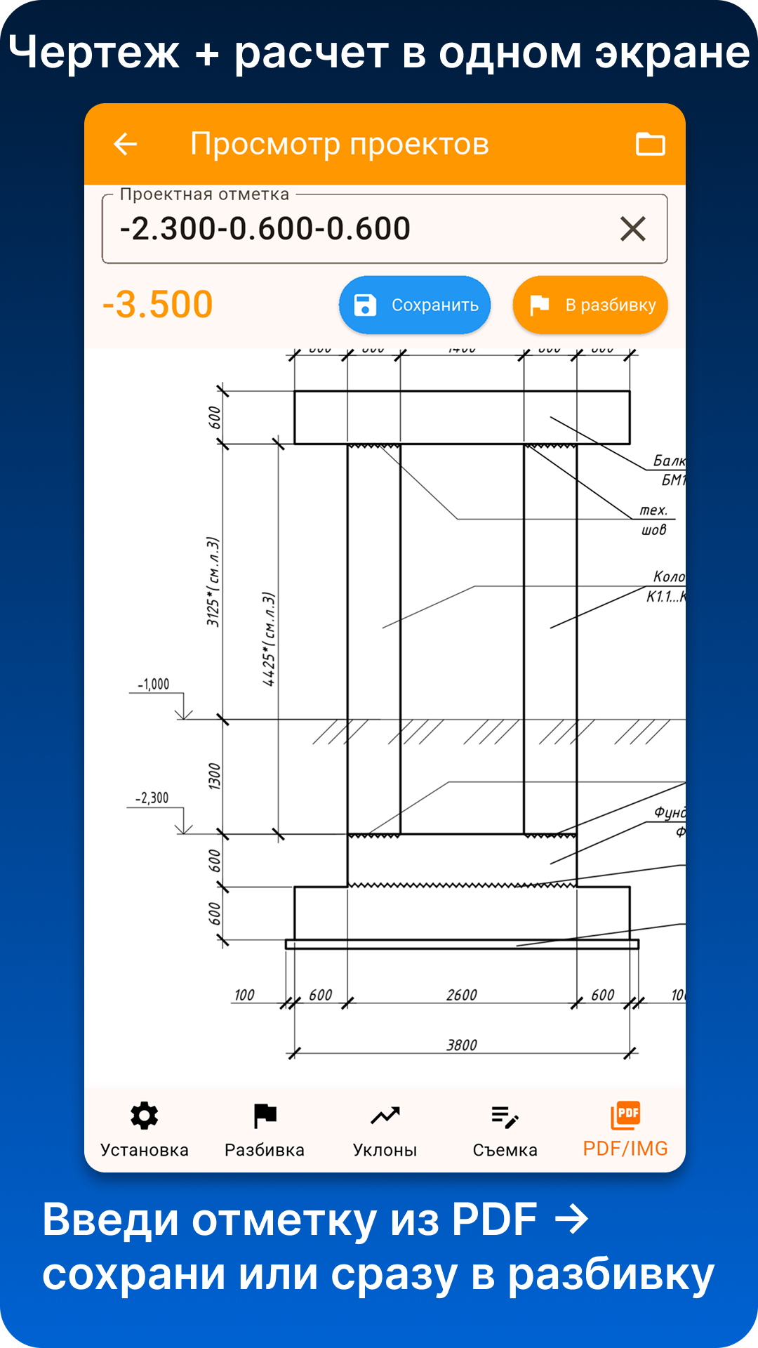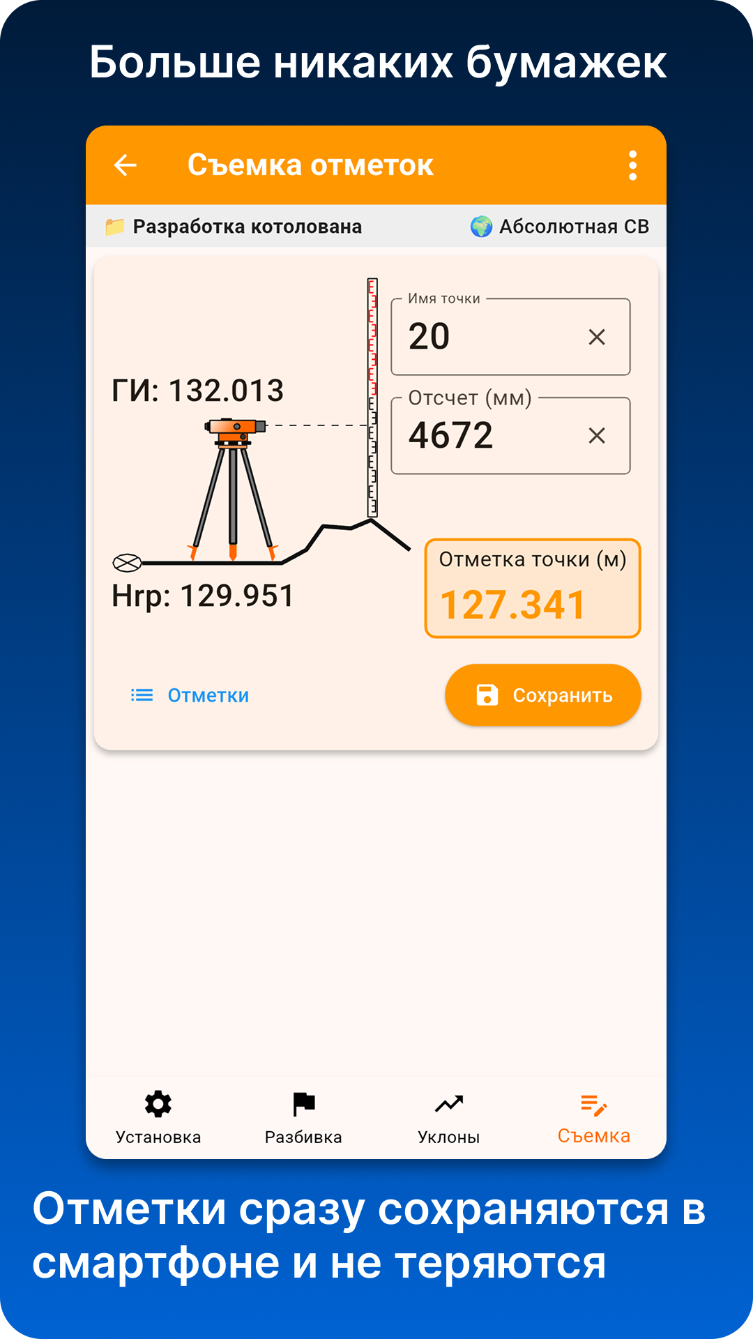 3. Разбивка отметок Введи проектную отметку или выбери её из библиотеки — приложение сразу покажет, какой отсчёт по рейке нужно получить. Это ускоряет вынос отметок в натуру и помогает избежать ошибок при ручных расчётах.