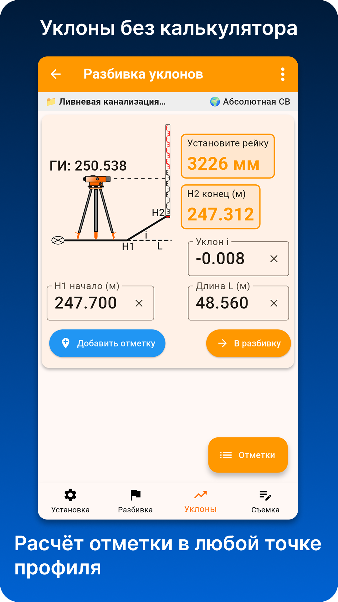 5. Разбивка уклонов Укажи начальную отметку, длину линии и уклон — приложение рассчитает итоговую высоту в нужной точке профиля. Подходит для трасс, дорог, бетонных работ, площадок, линейных объектов и других инженерных задач.