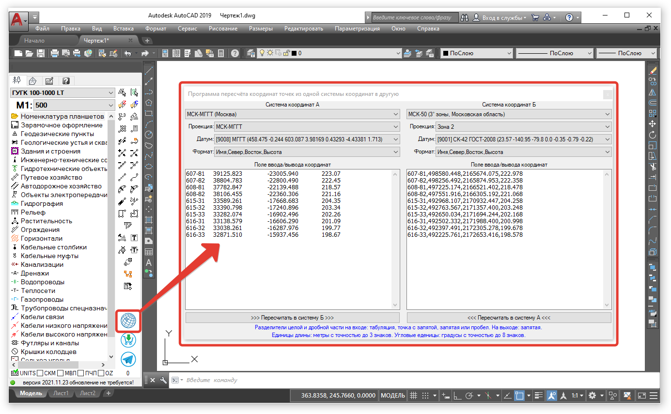 Реализована программа пересчета координат точек и одной системы координат в другую.
