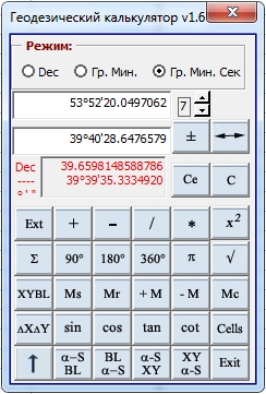 Давно хотел сваять что-то подобное, да все руки не доходили: начинал писать и бросал - слишком много мороки . Вроде простенький, а время отнял столько, что за это время можно было с десяток программ написать. В общем предлагаю вашему вниманию небольшой калькулятор заточенный именно под геодезию. Написан на VBA, поэтому работает только в Excel. Хелп с кратким описанием в архиве.
