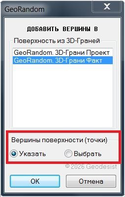 + Добавить вершины в поверхность из 3D-Граней, добавлена опция выбора способа добавления вершин (точек) поверхности: Указать или Выбрать.