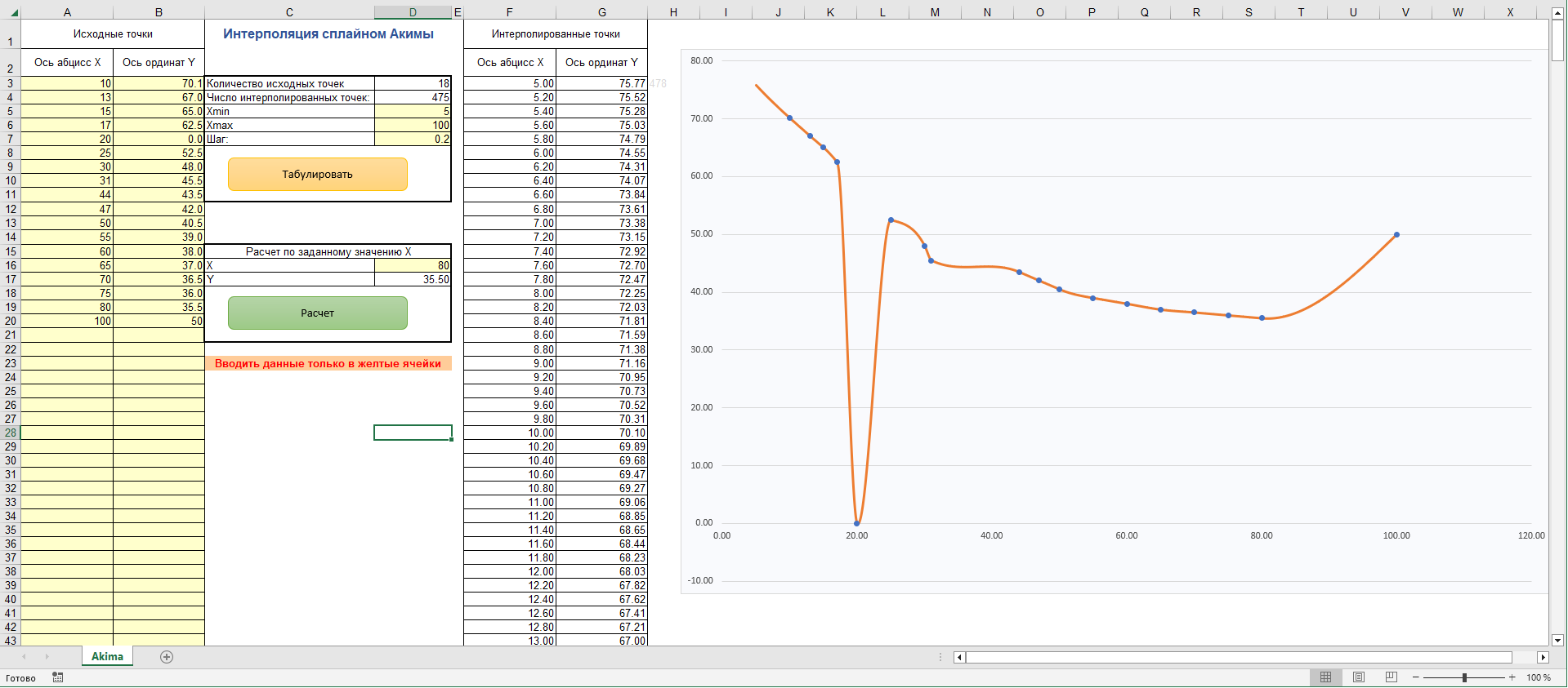 Интерполяция точек графика сплайном Акимы - Возможность получения значения Y с диаграммы по заданному Х. + табуляция.